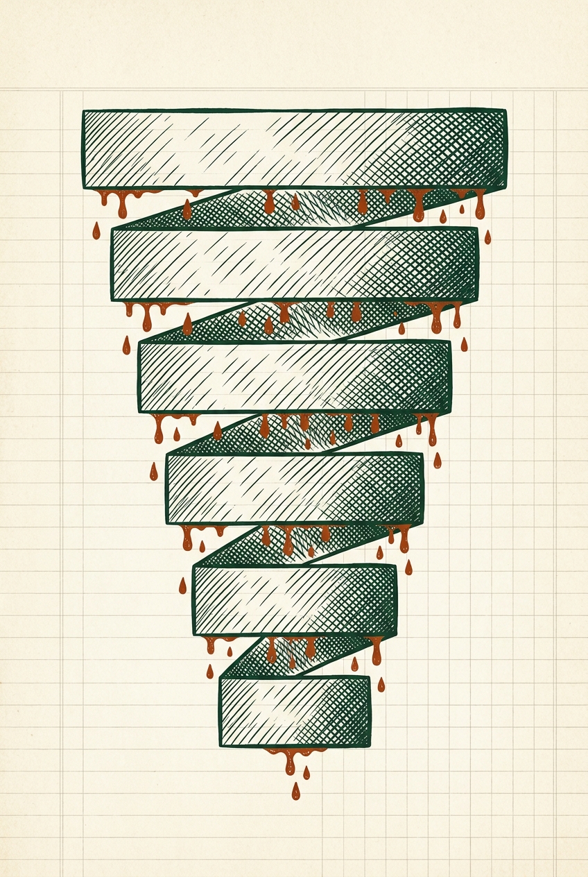 注 · 漏斗宽度按视觉感比例(log scale)画,不按数字真实比例——否则后面几层根本看不见。真实悬殊感请看下方对比表。